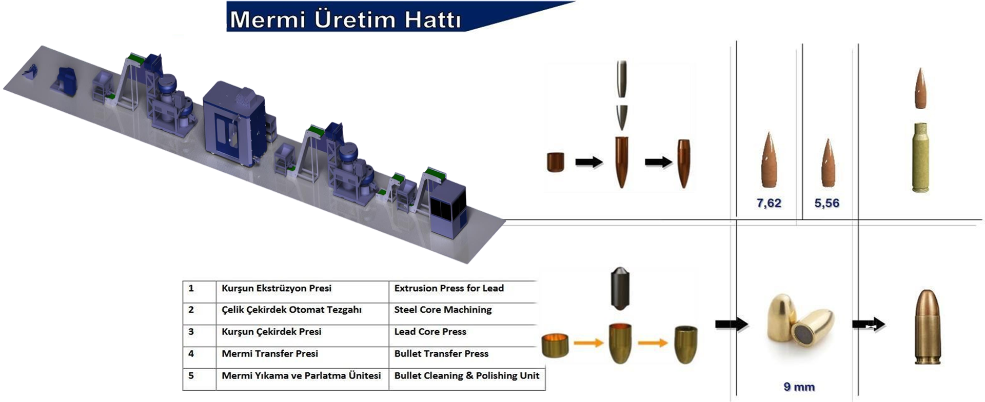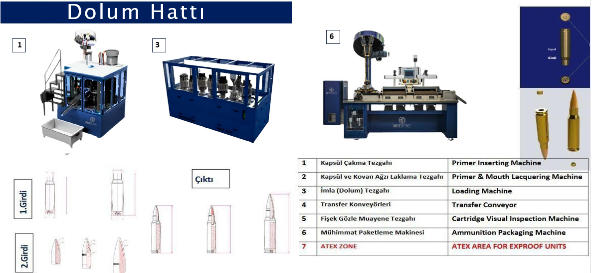 Hafif mühimmat tesisi kurulumu tecrübemiz ile inşaat ve tüm üretim hatlarının kurulması dahil 360 milyon adet/yıl kapasiteli tesis kurulumunu gerçekleştirdik. Tedarikçilerin belirlenmesi, NATO standartlarına ve mevzuatlara uygun inşaatın tamamlanması ve üretim proseslerinin standardize edilmesi dahil anahtar teslim hafif mühimmat (9x19, 5,56x45, 7.62x39, 12.7x99,12.7x108) tesisi kuruyoruz.